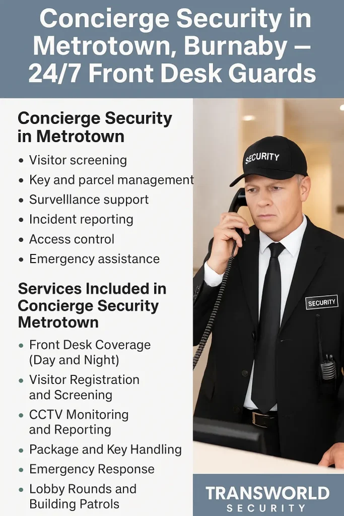 Metrotown is one of the most active communities in Burnaby. It has high-rise residences, retail shops, and office buildings. Concierge security services in Metrotown are no longer optional; they are necessary due to the high volume of people using the area.