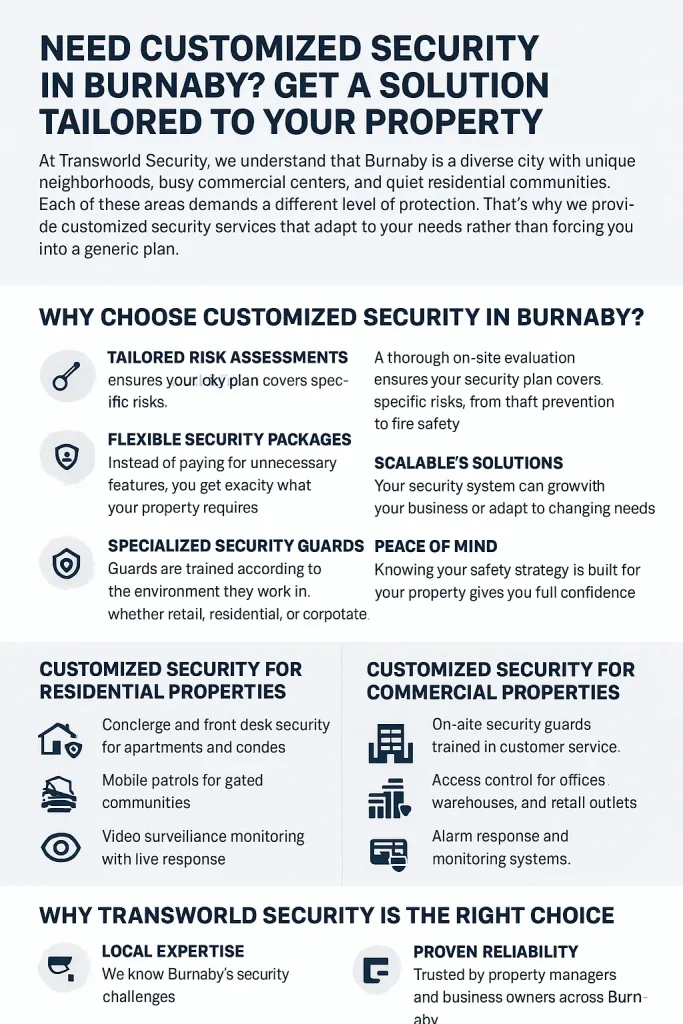 When you buy customized security in Burnaby, you get a solution that is tailored to your needs to secure your people, property, and reputation. We make programs at Transworld Security that fit your risks, budget, and long-term goals. Our techniques are different for each property. Transworld Security offers tailored protection for homes, businesses & properties. There is no longer a “one size fits all” answer for security. Every property has its own set of dangers, problems, and needs. Your safety plan should fit the place where you live, work, or run a business, whether it’s a residential building, a store, or a big corporate office. That’s when personalized security in Burnaby comes in.