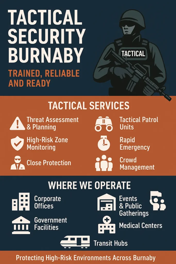 Burnaby is a booming city with a mix of homes, businesses, and factories. As cities expand and more people move there, the demand for improved protection in high-risk areas also grows. Tactical protection is important for: